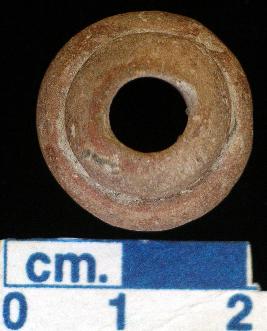 | Description / विवरण | A terracotta ghat shaped bead, red in colour, small in size, a ring base top like rim of a ghat, flat base due to sharp cut, a broad vertical hole across. |