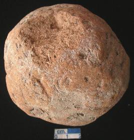 | Description / विवरण | Large-sized terracotta sling ball, irregular shape. |