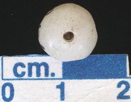 | Description / विवरण | A white stone bead, irrergual round in shape, a hole across. |