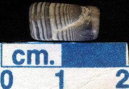 | Description / विवरण | A barrel shaped banded agate stone bead, white lines allover, horizontal hole across. |