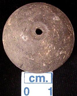 | Description / विवरण | An aricanut shaped bead, having a circular depression below, hole across and blackish in colour. |