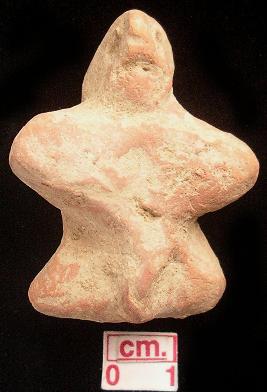 | Description / विवरण | A terracotta archaic human figurine with round head, pinched nose, punched eyes, slit open mouth, short out stretched stumpy arms, short wide bridged stumpy legs, punched navel, phallus indicated, hadmade. |