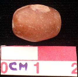 | Description / विवरण | A stone bead, carnelian, barrel shaped bearing dents on exterior surface. |