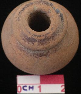 | Description / विवरण | Terracotta spindle whorl flat base, ribbed top, ghat-shaped. |