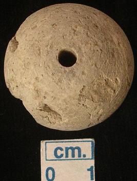 | Description / विवरण | An aricanut shaped bead, slightly damaged, flat base conical top reddish in colour. |