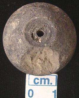 | Description / विवरण | A terracotta aricanut shaped bead, depression below and on the top. Blackish in colour. |