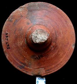 | Description / विवरण | Broken part of a terracotta stamp. Only upper part broken. The lower parts have an interesting decorative pattern. Flower with petals and dotted impressions in two tyres in circle. |