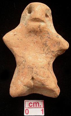 | Description / विवरण | A terracotta archaic human figurine with round head, pinched nose, pin hole eyes, slit open mouth, short out stretched stumpy arms, short wide bridged stumpy legs, pin hole navel, handmade. |