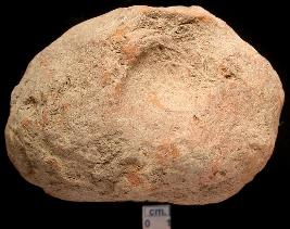 | Description / विवरण | A terracotta sling ball, irregular round, red. |