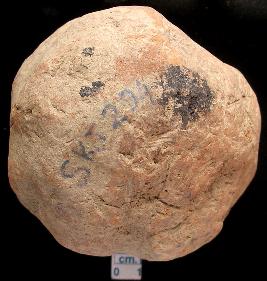 | Description / विवरण | Terracotta sling ball, irregular round, red, partly damaged. |