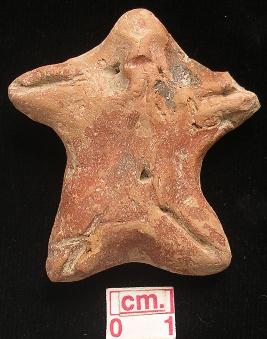 | Description / विवरण | A star shaped terracotta archaic figurine with small head, pin hole eyes, pinched nose, open mouth, short out stretched arms with one incised line in each, pin hole navel, short bridged stumpy legs with one incised line in each, treated with red slip, handmade. |