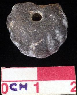 | Description / विवरण | A terracotta spherical bead, which has vertical even grooves giving the look of Rudraksh, Partly damaged, a vertical hole across. |