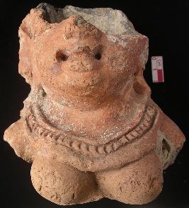 | Description / विवरण | A hollow terracotta female figurine, red in colour, treated with red slip, forehead and eyes broken, smiling lips, wearing applique necklace with incised design on unclothed brest, lower is broken and missing. |