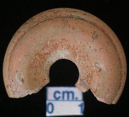 | Description / विवरण | Terracotta, red slipped, ghat-shaped bead with half portion is completely disappeared. |