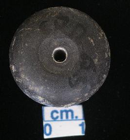 | Description / विवरण | Terracotta black slipped areca-nut shaped bead, top has a depression around the top hole. |