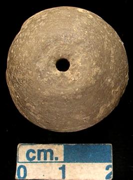 | Description / विवरण | An Aricanut shaped bead, depression below flat top, blakish colour, across hole. |