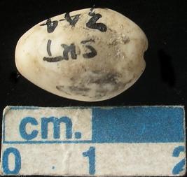 | Description / विवरण | An aricanut shaped bead, small, red, depression below, hole across. |