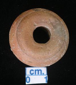| Description / विवरण | Terracotta, red ghat shaped spindle-whorl flat base. |