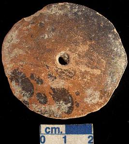 | Description / विवरण | Pottery hopscotch of red ware, perforation on center, circular. |