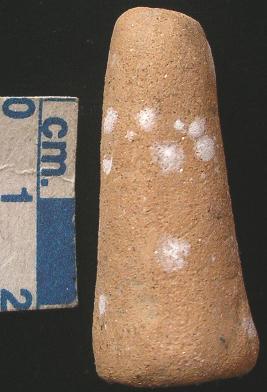 | Description / विवरण | Terracotta gamesman, reddish, Flat base and conical top. |