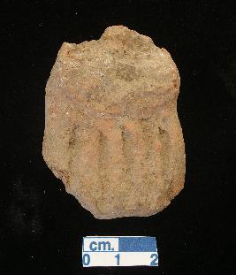 | Description / विवरण | Terracotta fragmentary left foot of a human figure. The toe is having incised grooves indicating the thumb and the finger. It is made of coarse-grained clay with gritty core. |