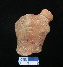 | Description / विवरण | Terracotta, head of female, bun on the left, embossed diamond shaped eyes, pinched ears, nose slightly damaged, split mouth, a hole on the head through the neck across. |