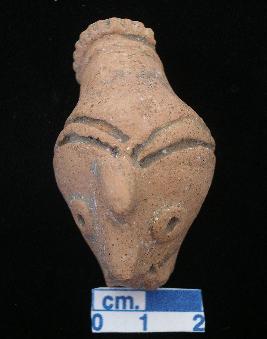 | Description / विवरण | Fragment of terracotta, head of a female, the hair tied up. Two grooves on each side of the forehead indicating eye brows. A pointed projection on the forehead is indicating an ornament. The eyes round with circular punchers in the middle. Pinched nose. The lower portion is broken. The grooves and around eyes show remains of yellowish golden lines being painted. |