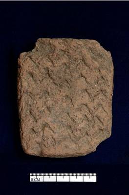 | Description / विवरण | Fragmentary terracotta dabber having horizontal zigzag lines on its badly. |