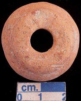 | Description / विवरण | Tettacotta ghat-shaped spindle whorle, red, flat around base perforation. |