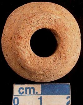 | Description / विवरण | Terracotta ghat- shaped spindle whorl, dull red, flat base. |
