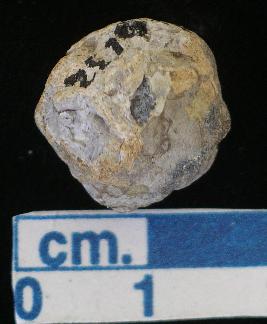 | Description / विवरण | Stone, marble, slightly damaged, greyish, irregular round. |