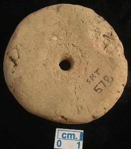 | Description / विवरण | Terracotta handmade wheel with a hole in the center, ill fired. |