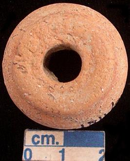 | Description / विवरण | Terracotta ghat- shaped spindle whorl, reddish, flat around base perforation. |