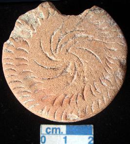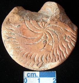 | Description / विवरण | Terracotta disc, damaged, red, notches on the periphery on both the surfaces, sides are plain, bearing solar symbol in the center, large sized. |