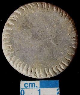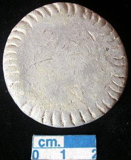 | Description / विवरण | Terracotta disc, grey, made of well-levigated clay, plain section and curvilinear peripheral notches on both the surfaces. |
