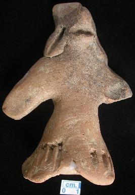 | Description / विवरण | Terracotta human figurine, hollow base, bearing frock, left hand broken, right tiny. Splited mouth, elongated ears, a hole to hang it on wall above head. |