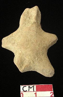 | Description / विवरण | A star shaped terracotta archaic human figurine, with broken head, red, hand made, traces of pin hole eyes, pinched nose, traces of open slit mouth, short out stretched stumpy arms, pin hole navel, short wide bridged stumpy legs right one broken. |
