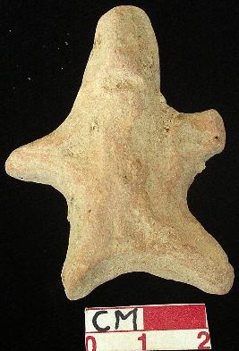 | Description / विवरण | A terracotta archaic human figurine with elongated head, punched eyes, pinched nose, slit mouth, out stretched stumpy arms, punched navel, wide bridged stumpy uneven legs, treated with red wash, handmade. |