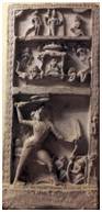 | Description / विवरण | This is a decorative slab of three parts. The edges of this slab is decorated with geomatric patron . One Ajaekapada Bhairava image is depicted in upper part of this slab.Two flying ladies, fly away a queen with her viman are depicted in middle part of this slab. The last part of this slab has male figure holding a parsu and bow in his hand and is in fighting posture. Under this another male figure holds war weapons in his hand and oppose him. |
