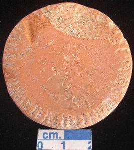 | Description / विवरण | Terracotta disc, red, made of well- levigated clay, sides are plain, both surfaces bear vertical notches on the peripheral, one surface is slightly damaged. |