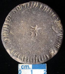| Description / विवरण | Terracotta disc, black, ill-fired, made of well levigated clay, plain sides, both the surfaces bear notches on the periphery and a solar symbol in the center. |