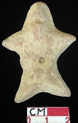 | Description / विवरण | A terracotta archaic human figurine with round head, punched eyes, pinched nose, open slit mouth, pointed out stretched stumpy arms, punched navel, pointed wide bridged stumpy legs, treated with red wash, handmade. |