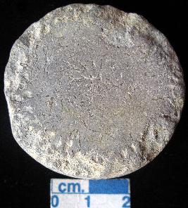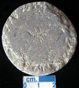 | Description / विवरण | Terracotta disc, grey, made of well-levigated clay, both the surfaces are slightly damaged, bear notches on the periphery and crudely executed solar symbol in the center and plain sides. |