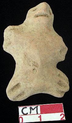 | Description / विवरण | A terracotta archaic human figurine with round head tilted towards left, punched eyes, pinched nose, slit mouth, both arms are damaged, punched navel, short wide bridged stumpy legs with three incised lines in left and two incised lines in right, treated with red wash, handmade. |