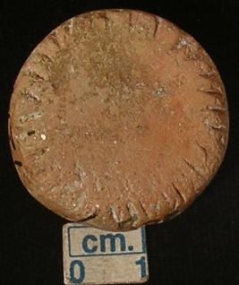 | Description / विवरण | Terracotta disc, reddish, made of well-levigated clay, plain sides, both the surfaces bear oblique notches on the periphery. |