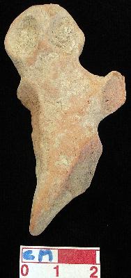 | Description / विवरण | A terracotta archaic human figurine with round head, punched eyes, pinched nose and mouth, short out left arm is partly damaged, pointed stumpy right leg but left leg is broken, dull red colour and handmade. |