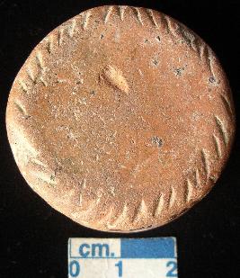 | Description / विवरण | Terracotta disc, red, made of well-levigated clay, plain section, both the surfaces have oblique notches on the periphery. |
