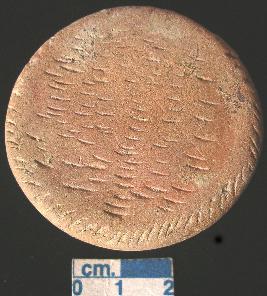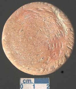 | Description / विवरण | Terracotta disc, large sized, red ,plain surfaces with nail notches, both the surfaces bear notches on periphery, sides are plain. |