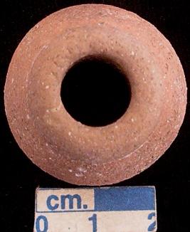 | Description / विवरण | Terracotta ghat- shaped spindle whorl, mica particles are seen on the surface, flat base. |