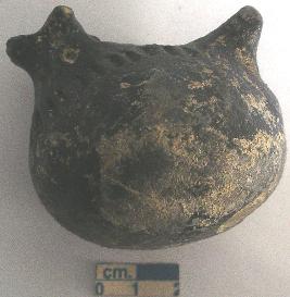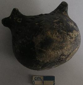 | Description / विवरण | A bird shaped terracotta rattle, black slipped all over, feathers around neck, back and tail indicated by notches, is almost round. |